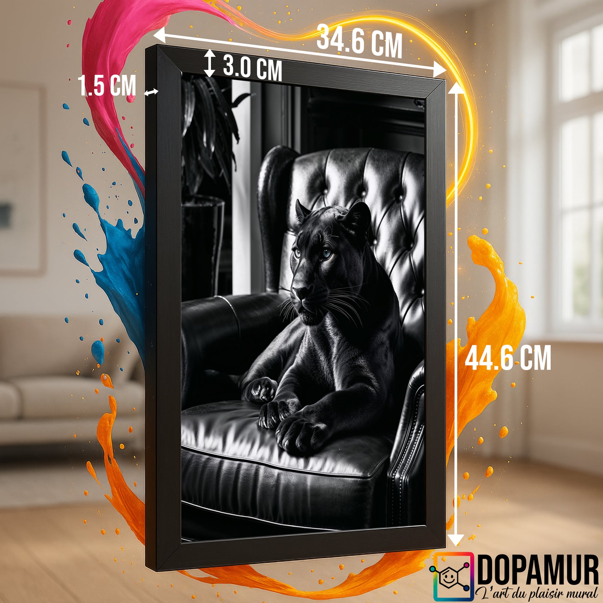 Imprégnez votre espace du charme dangereux et du luxe absolu avec ce tableau envoûtant signé Dopamur. Cette pièce unique installe l'élégance féline d'une panthère sur un trône de cuir capitonné, dans un jeu d'ombres et de lumières dramatique. Le contraste entre la sauvagerie de l'animal et le raffinement du mobilier crée une atmosphère mystérieuse, puissante et indéniablement glamour. Parfait pour un intérieur au caractère fort, un bureau masculin ou un salon aux ambiances confidentielles, ce tableau incarne l'esprit Dopamur : l'art qui explore la séduction de l'ombre et le luxe des matières sensuelles.