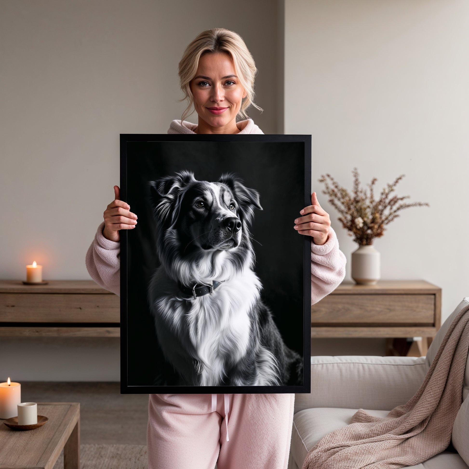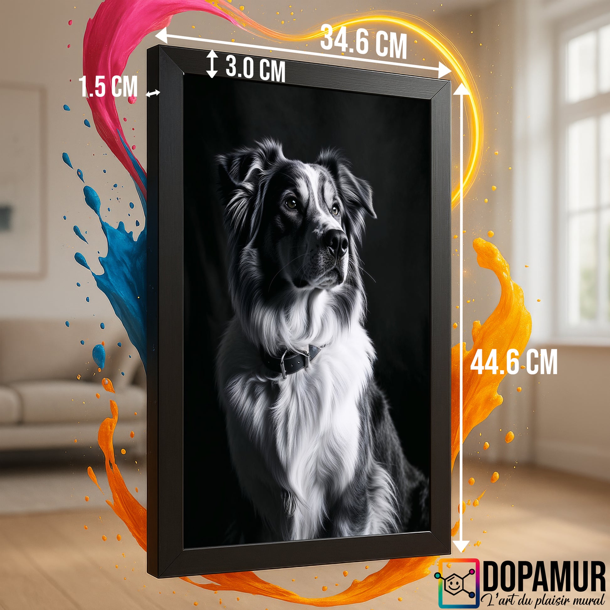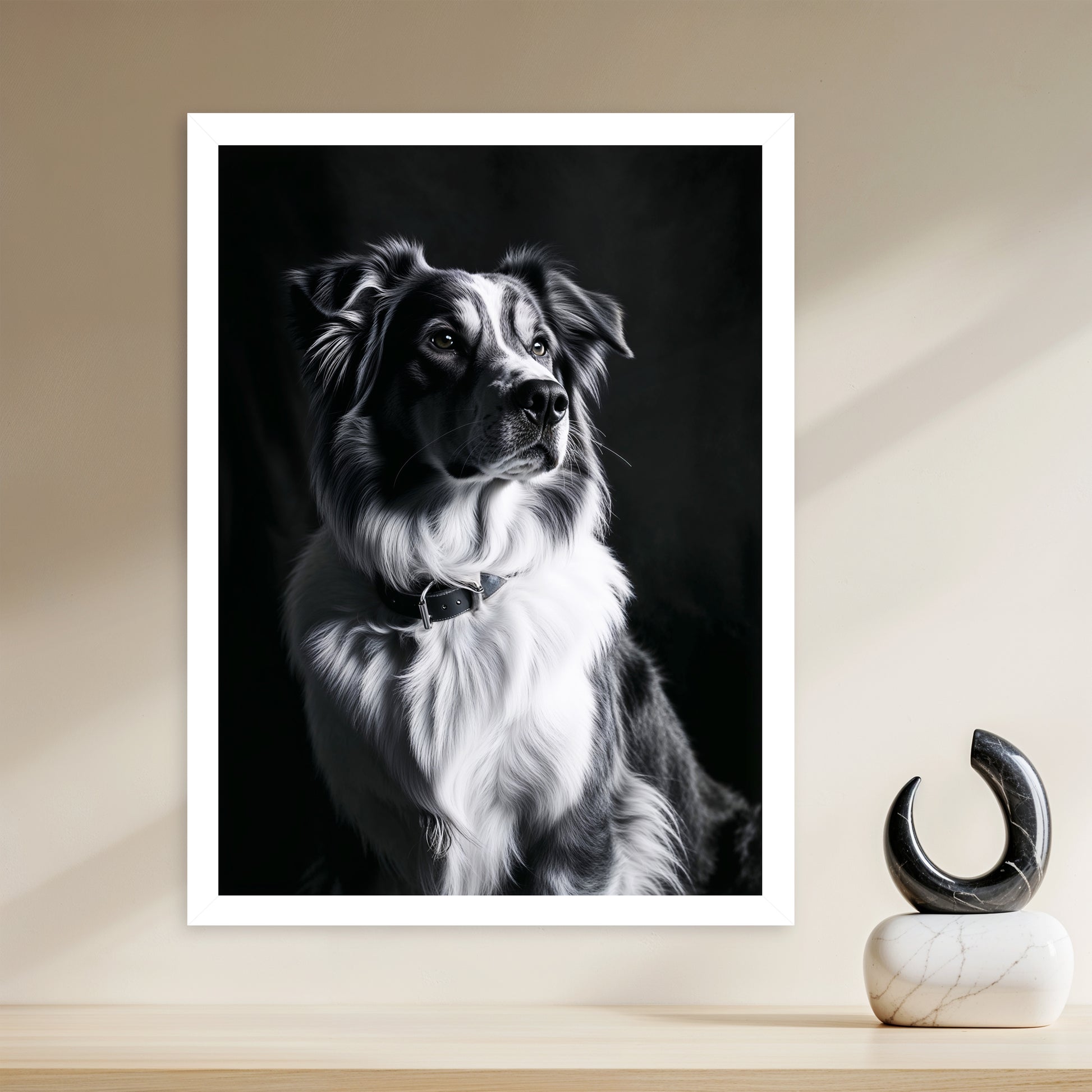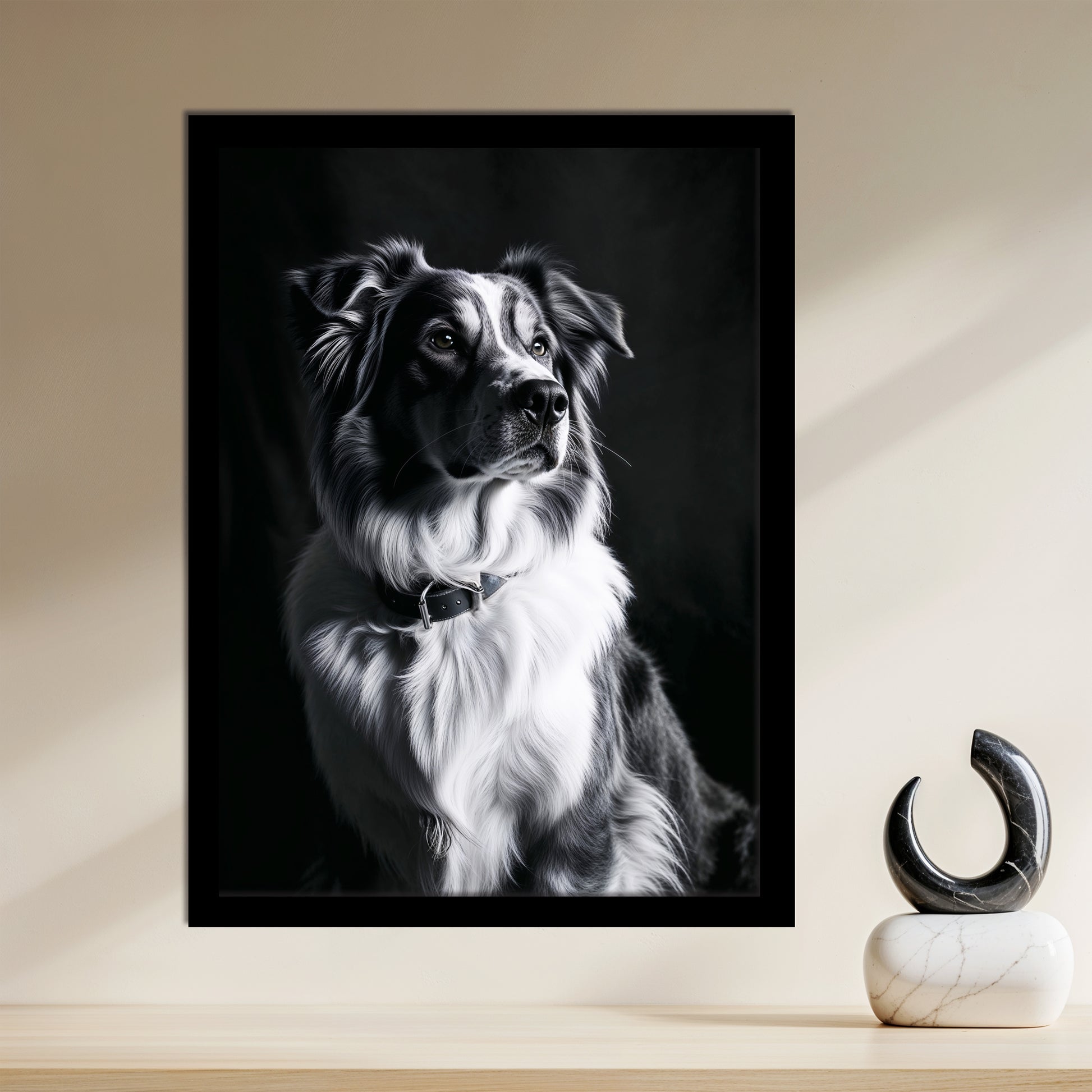 Offrez à votre intérieur la douce prestance et la loyauté apaisante d'un compagnon noble avec ce tableau signé Dopamur. Cette pièce unique capture l'expression sage et tendre d'un berger australien, magnifiée par un éclairage professionnel qui sculpte son pelage en noir et blanc. L'émotion qui émane de ce portrait est celle d'une sérénité profonde et d'une élégance naturelle. Idéal pour créer une ambiance cosy et raffinée dans un salon ou un espace de détente, ce tableau parle à tous ceux qui chérissent la beauté discrète et la fidélité. Il incarne l'esprit Dopamur : l'art qui célèbre la noblesse tranquille du quotidien.