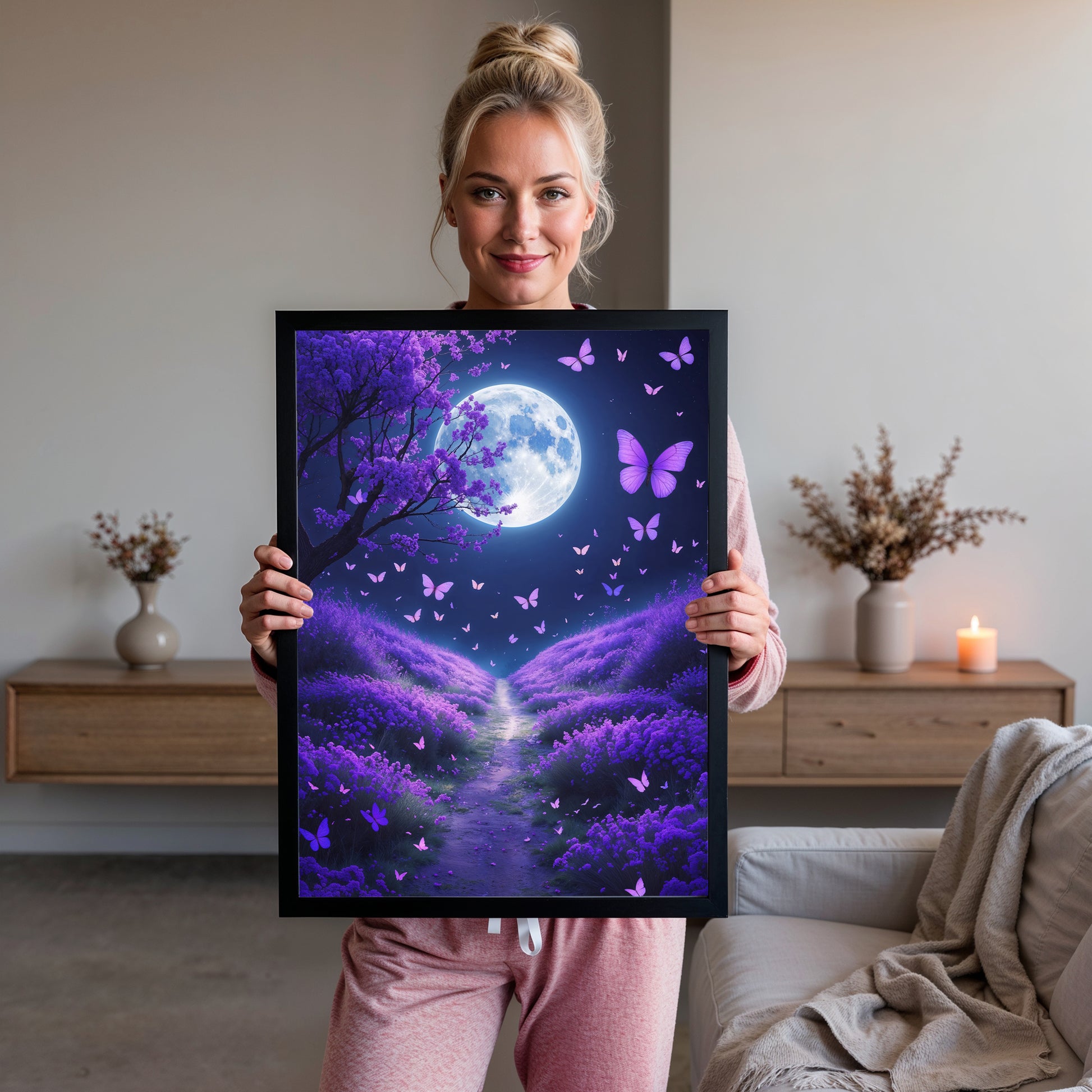 Enveloppez votre espace d'une douceur féerique et d'une lumière apaisante avec ce tableau onirique signé Dopamur. Cette pièce unique plonge le spectateur dans une forêt nocturne baignée de lueurs violettes, où un nuage de papillons luminescents danse dans les airs. L'atmosphère est magique, silencieuse et propice à l'évasion mentale. Parfaite pour créer un sanctuaire de calme dans une chambre, un coin lecture ou un espace de bien-être, cette œuvre est un baume pour l'esprit. Elle incarne l'esprit Dopamur : l'art qui ouvre une porte vers le merveilleux et apaise l'âme.