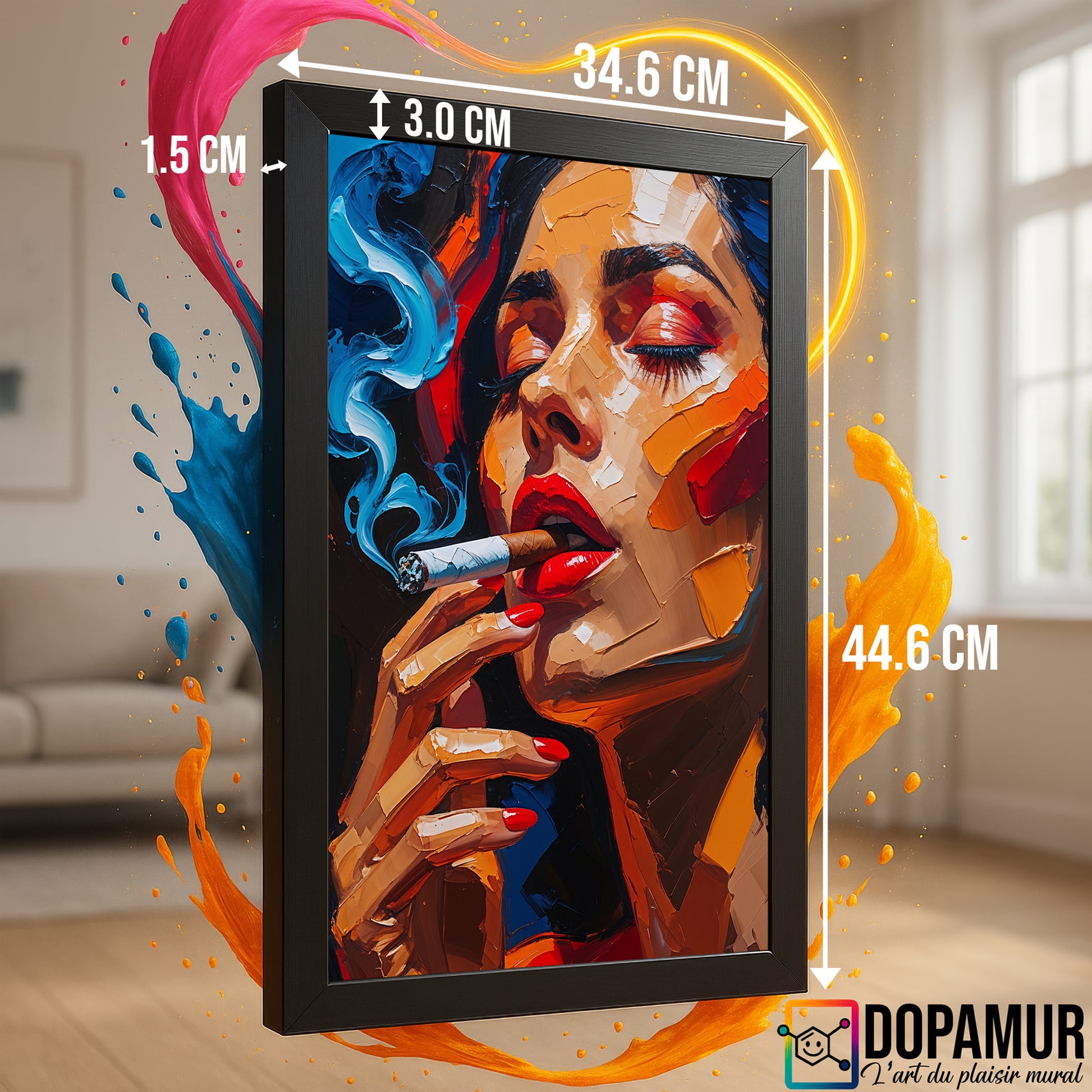 Osez l'audace et le mystère avec ce tableau portrait contemporain signé Dopamur. Cette pièce unique explore la profondeur d'un caractère à travers une explosion de couleurs et une texture captivante. L'effet peinture et le relief travaillé créent une atmosphère à la fois intense et énigmatique, invitant à la contemplation. Parfait pour devenir le point focal d'un intérieur moderne et affirmé, ce tableau dégage une puissance stylistique indéniable. Pour les collectionneurs en quête d'une œuvre qui dialogue avec la modernité et l'expression brute, ce portrait incarne l'esprit Dopamur : l'art qui interroge, fascine et libère l'émotion.