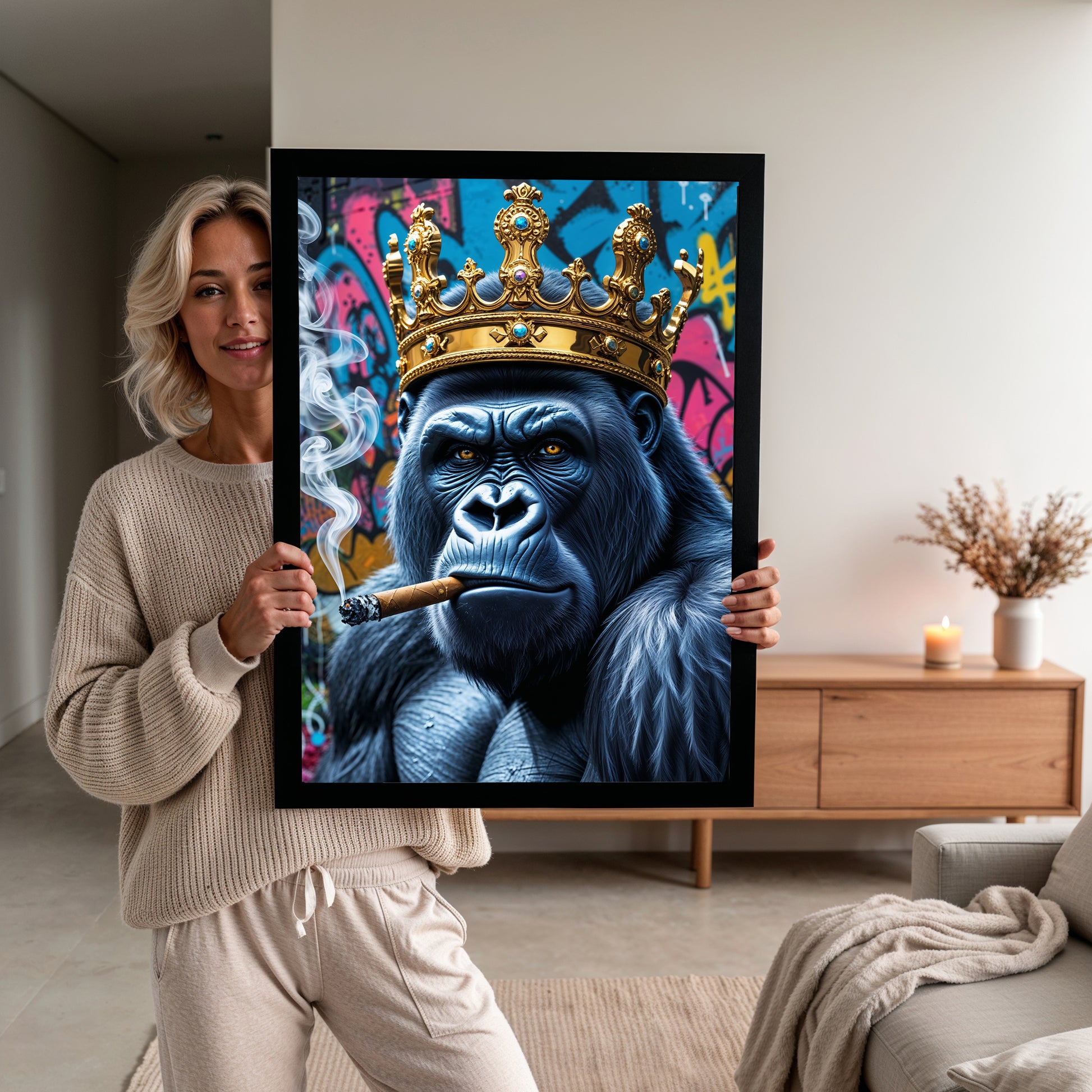 Revendiquez un style audacieux où le street-art rencontre les attributs du pouvoir avec ce tableau iconique signé Dopamur. Cette pièce unique couronne un gorille d'une attitude souveraine, cigare aux lèvres, sur un fond de graffitis vibrants. Le mélange détonnant de l'organique, du urbain et du luxe crée une œuvre au caractère fort et résolument moderne. Parfaite pour dynamiser un loft, un espace de vie ou un bureau créatif, cette pièce impose le respect avec une touche d'irrévérence glamour. Elle incarne l'esprit Dopamur : l'art qui fusionne les cultures pour créer un nouveau langage de prestige.