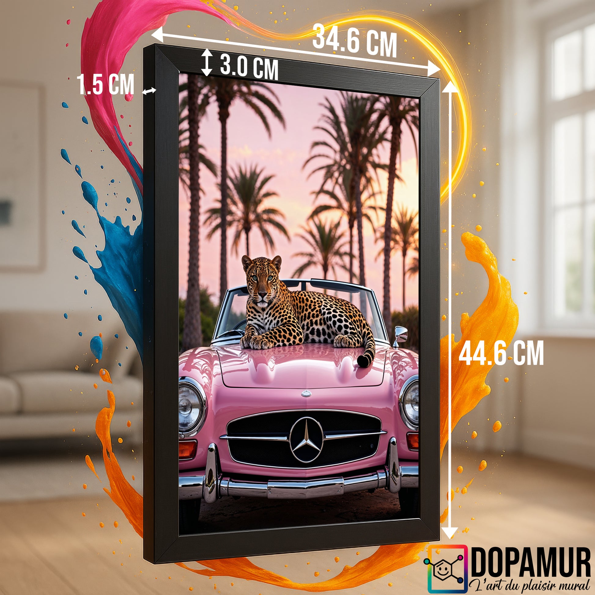 Plongez dans un rêve glamour et rétro-futuriste avec ce tableau audacieux signé Dopamur. Cette pièce unique transporte le spectateur dans une scène de safari revisité, où un jaguar élégant prend possession d'une Mercedes vintage rose, sous des palmiers stylisés. L'alliance du félin, de l'automobile iconique et de la couleur vibrante crée une œuvre tendance, luxueuse et pleine de récit. Parfaite pour un intérieur assumant son côté spectaculaire et hédoniste, cette pièce est une invitation au voyage stylisé. Elle incarne l'esprit Dopamur : l'art qui mélange les époques et les genres pour créer une évasion chic et colorée.
